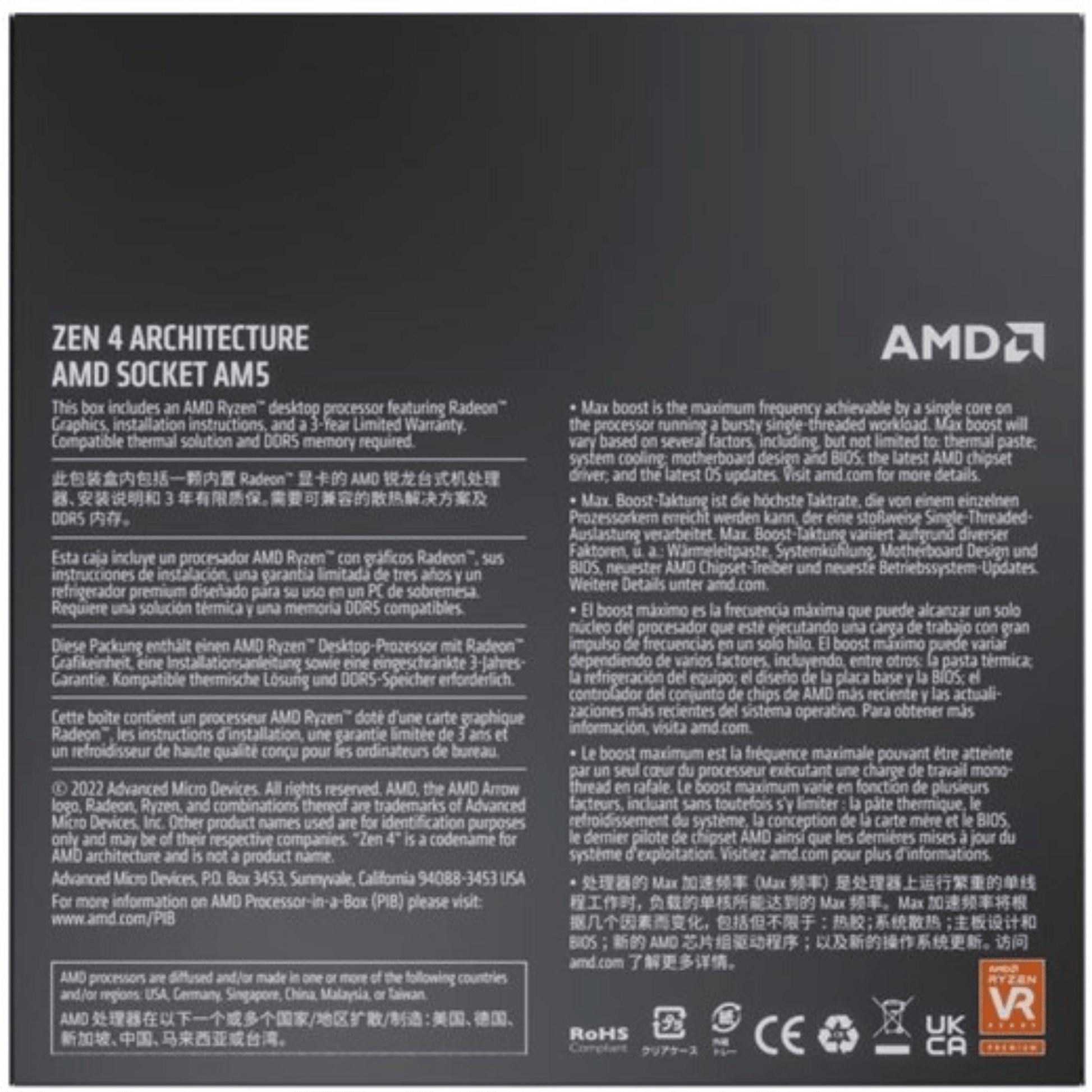 The all-new AMD Ryzen 7000 Series processors are packed with state-of-the-art technologies for an effortlessly modern PC. Highlights include high-speed DDR5 memory, PCIe® 5.0 support, AMD EXPO™ one-touch memory overclocking, and hyper-efficient 5nm manufacturing. Put an AMD Socket AM5 motherboard at the heart of your rig to dominate the games you love today and tomorrow. If your PC needs the latest and greatest capabilities, insist on AMD Ryzen™ processors..