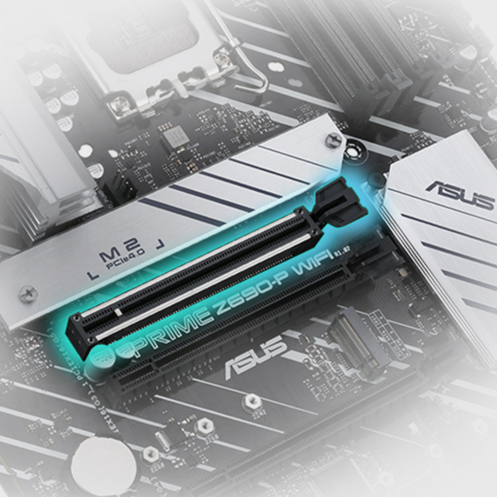 Prime Z690-P WiFi offers a total of three M.2 slots that support data-transfer speeds of up to 64 Gbps via PCIe® 4.0, enabling quicker boot-up and app load times with OS or application drives.