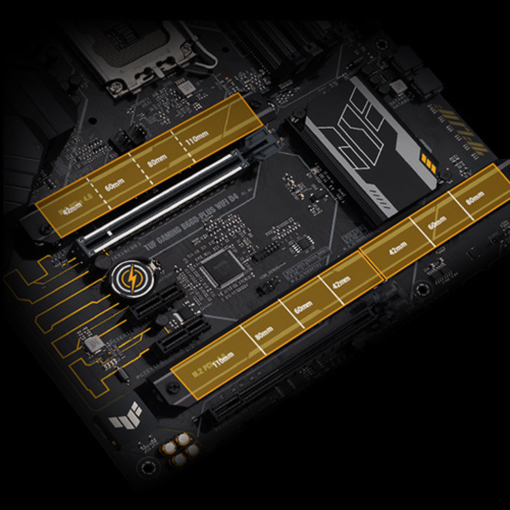 Extensive USB support ensures connections to a wide array of peripherals. TUF GAMING B660-PLUS WIFI D4 includes a USB 3.2 Gen 2x2 Type-C® port on the rear I/O panel that delivers increased bandwidth and transmission speeds of up to 20 Gbps.