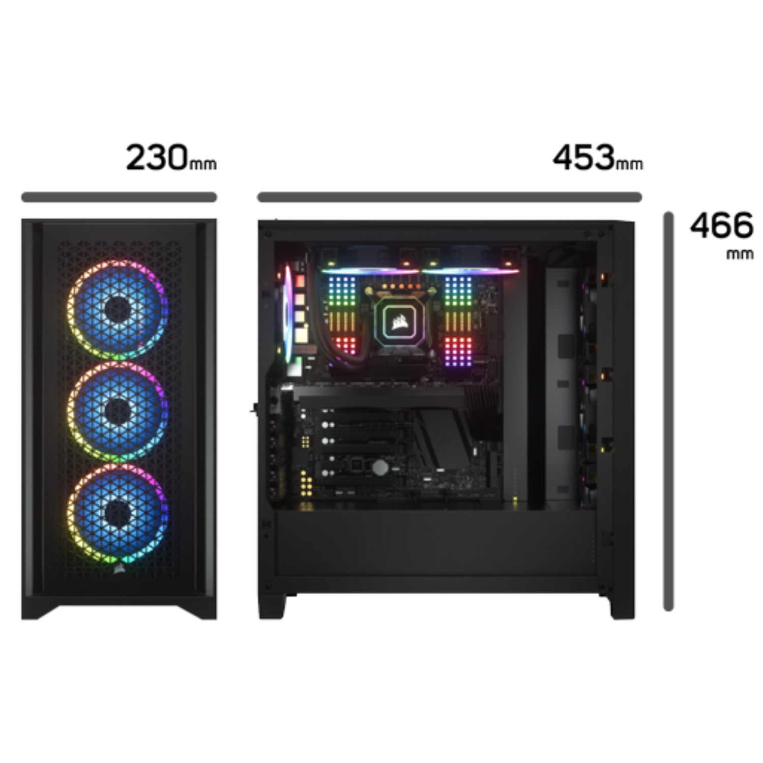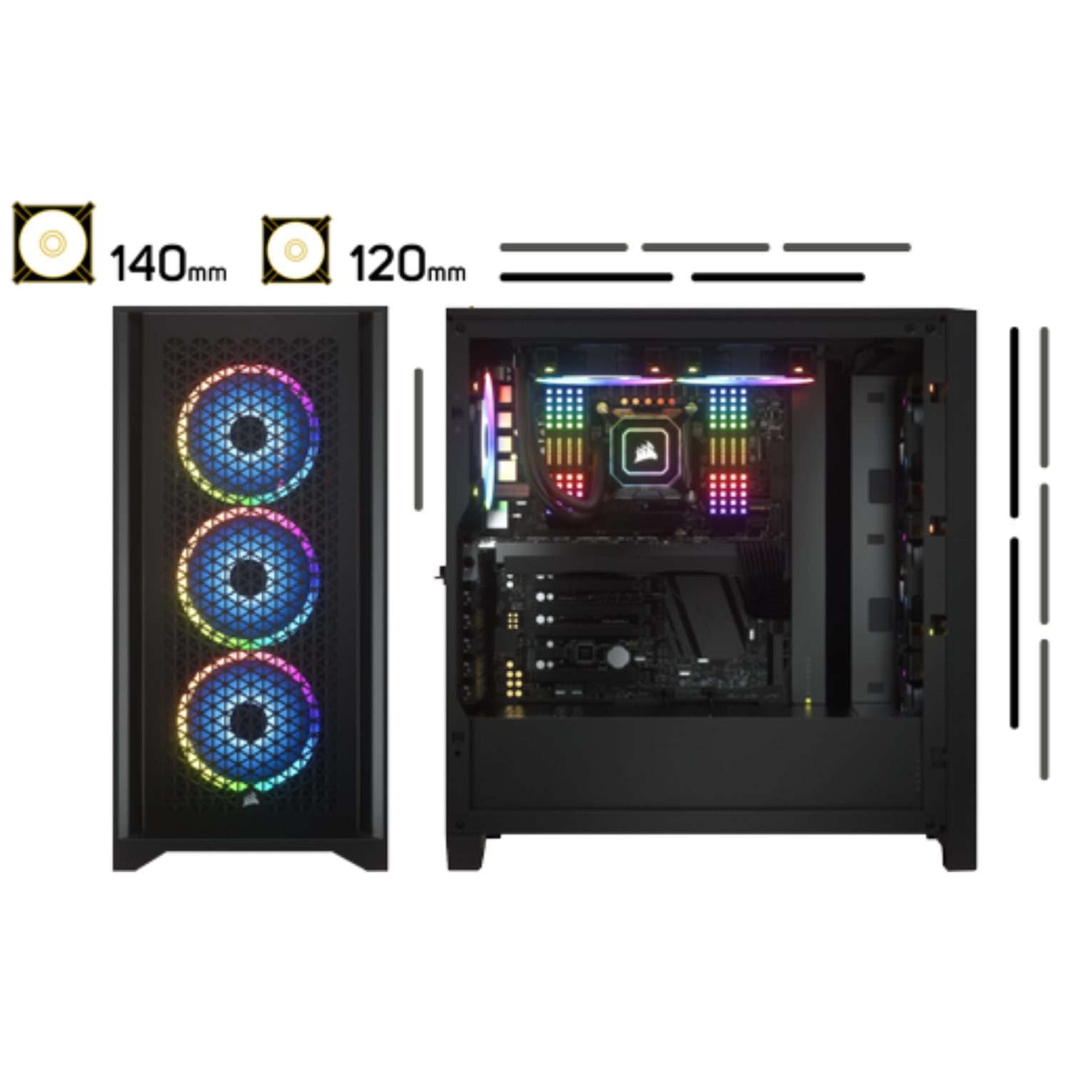 Equipped with two CORSAIR 120mm AirGuide fans, utilizing anti-vortex vanesTo concentrate airflow and enhance cooling.