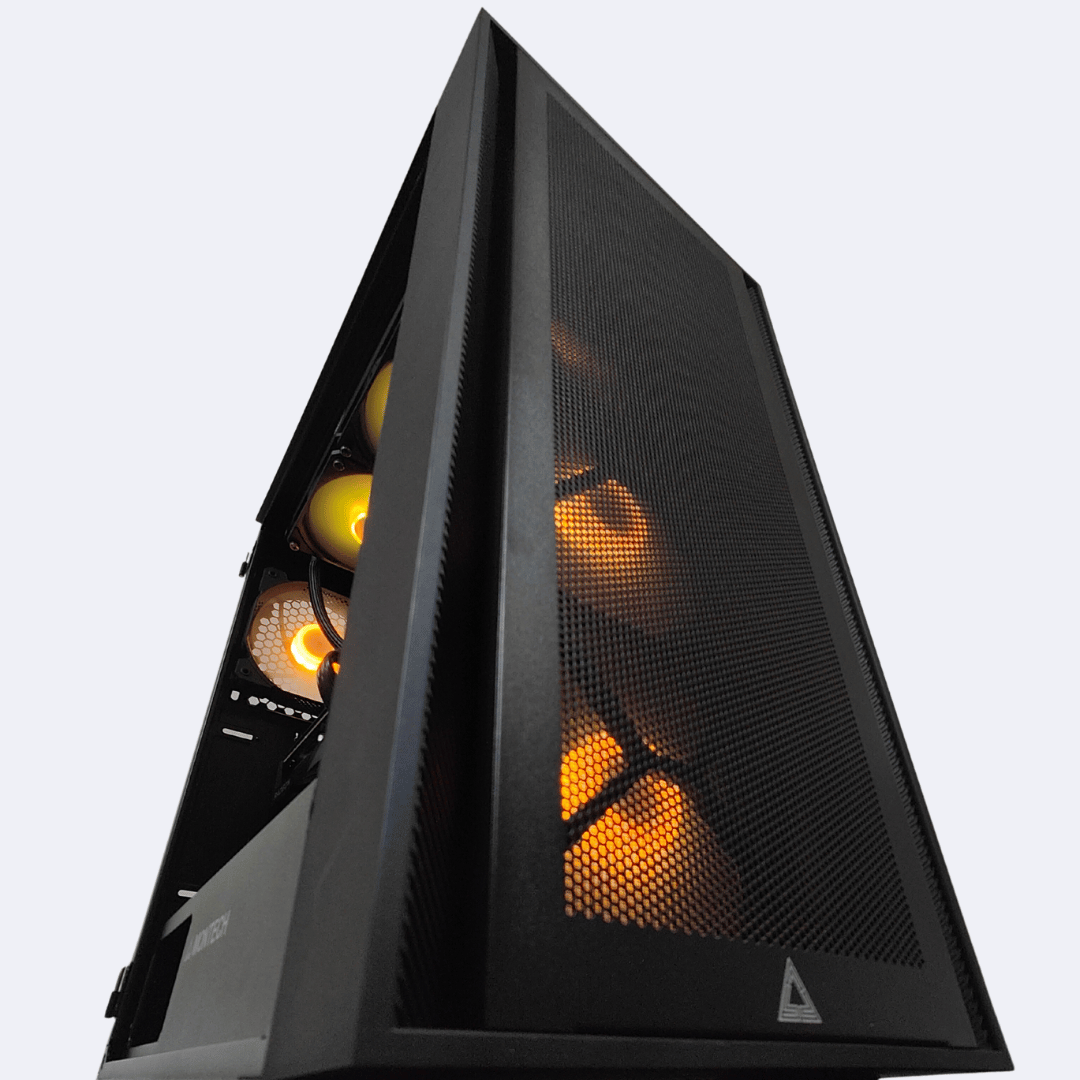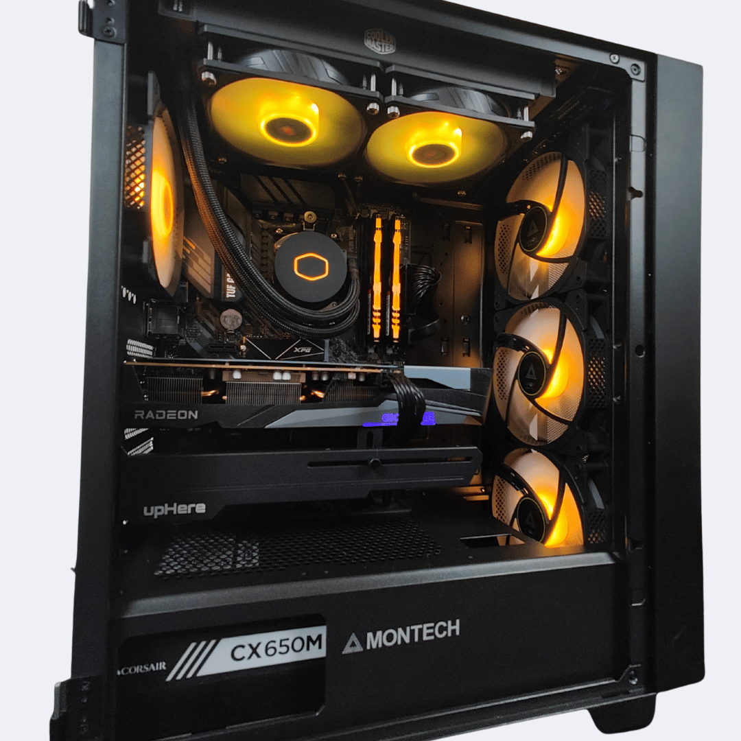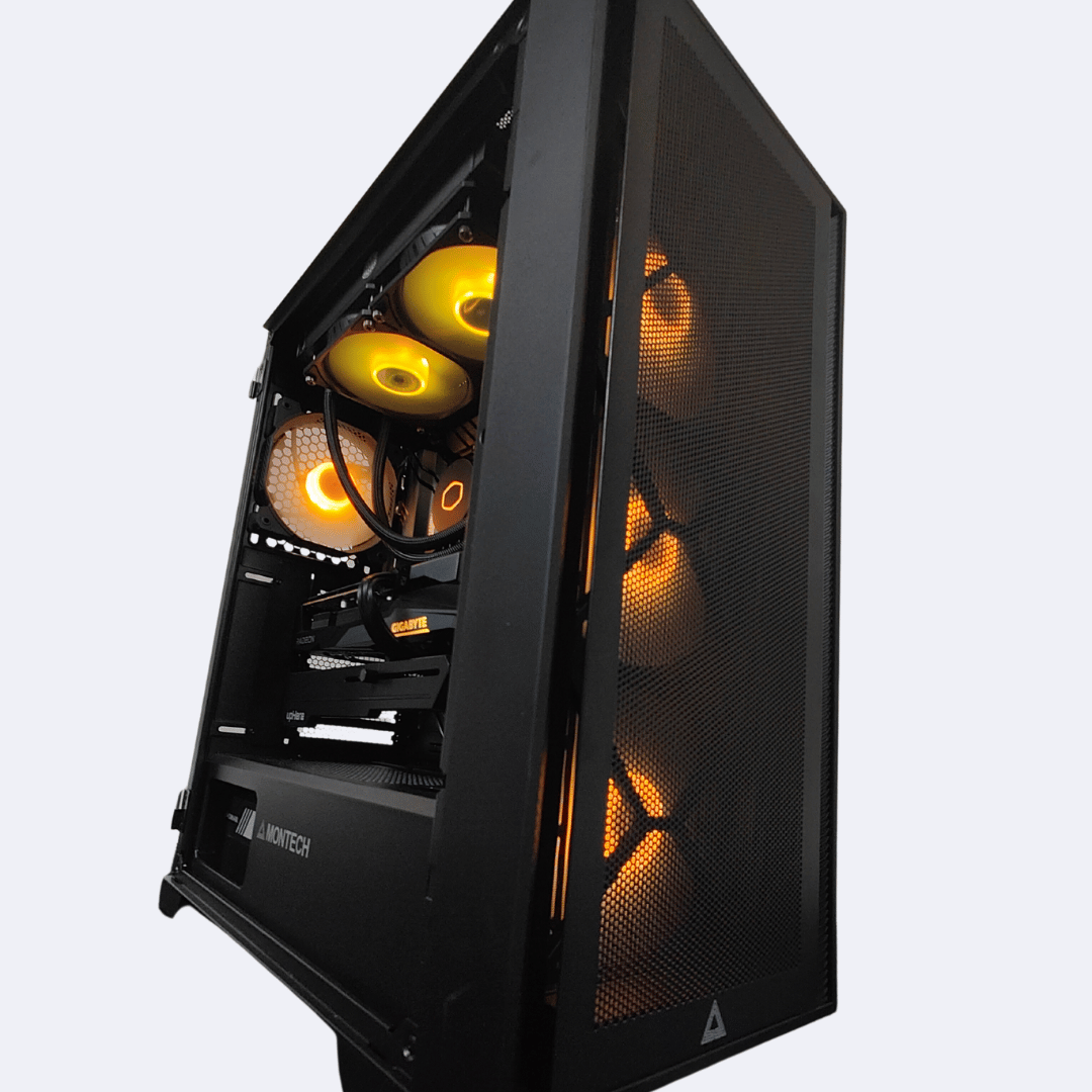 The components are housed in a stylish Montech case with a tempered glass side panel to show off the RGB lighting from the RAM and cooler.